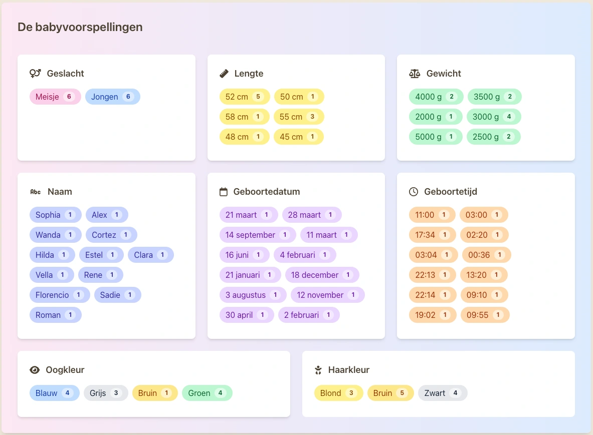 Crie em poucos cliques um baby pool único para sua gravidez. Personalize as perguntas como sexo, nome, comprimento, peso e mais. Escolha uma foto de convite alegre e um esquema de cores.
